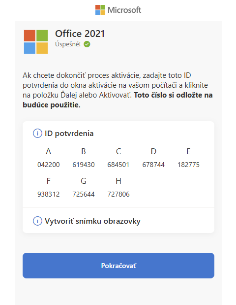 | 11. Po kliknutí na odoslať prejdete na stránku, kde vám Microsoft vygeneruje potvrdzovací kľúč, ktorý treba vložiť do prázdnych polí v okne pri Office aplikácii, ktorú máte otvorenú (viď obrázok pod 6.krokom tohto návodu, krok 3). Po zadaní potvrdzovacieho kľúča kliknite na ďalej a Microsoft Office balík je aktivovaný a uvidíte oznámenie o úspešnej aktivácii (viď obrázok nižšie). |